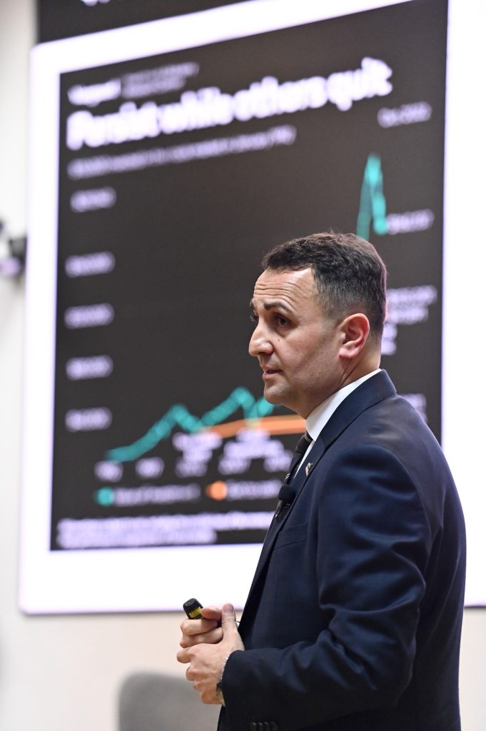 „Во воспоставувањето динамична рамнотежа меѓу суровата реалност на пазарните потреси и рационалниот оптимизам за вложување во акции, клучот лежи во транзицијата од ризик кон конзистентност, одлучност и истрајност”, децидно објаснува Костадиновски.