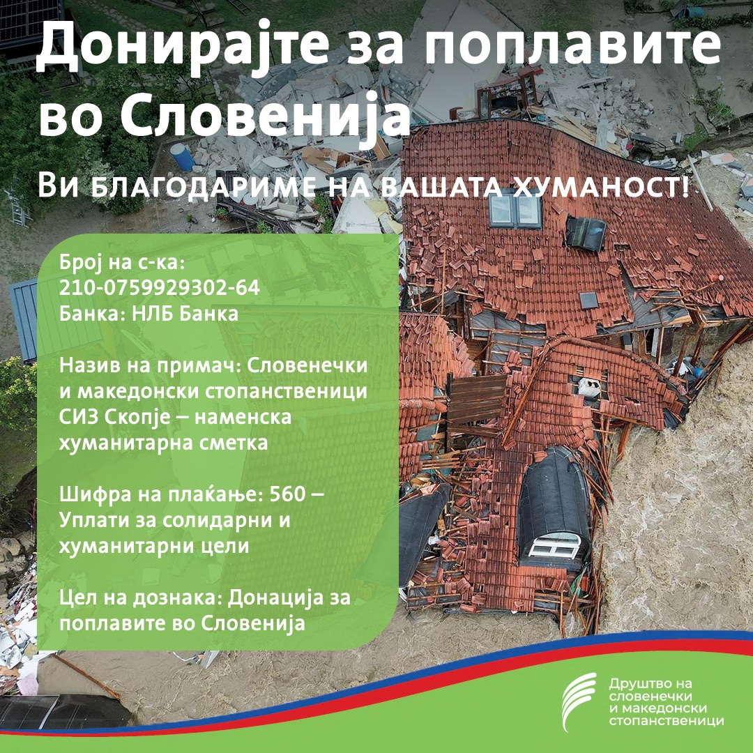 Повеќе од 30.000 евра донации за неодамнешните поројни дождови и невремиња беа собрани во акцијата на Друштвото на словенечки и македонски стопанственици. Голем дел од членството, но и други деловни субјекти и индивидуалци, донираа пари и ја покажаа својата хуманост кон граѓаните кои изгубија домови и кон Словенија која ја доживеа најголемата природна катастрофа во својата понова историја и се соочува со сериозно оштетена инфраструктура и домаќинства.
