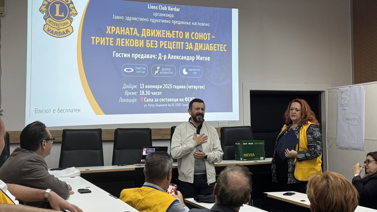 Во екот на заложбите за подигнување на јавната здравствена свест, ЛК Вардар успешно организираше и реализираше значајно едукативно предавање под наслов „Храната, движењето и сонот – Трите лекови без рецепт за дијабетес“. Настанот, кој беше отворен за целата јавност со бесплатен влез, се одржа на 13 ноември 2025 година, во четврток, во просториите на Салата за состаноци на ФЕИТ во Скопје.